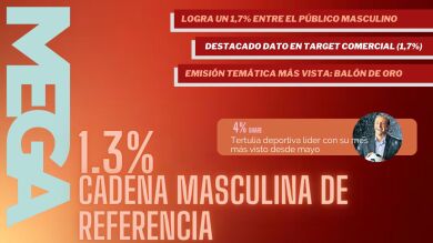 Mega (1,3%) logra la emisión temática más vista con la Gala del Balón de Oro y sigue líder con ‘El Chiringuito’. Mega es la temática masculina de referencia y destaca en hombres (1,7%) y en Target Comercial (1,7%).