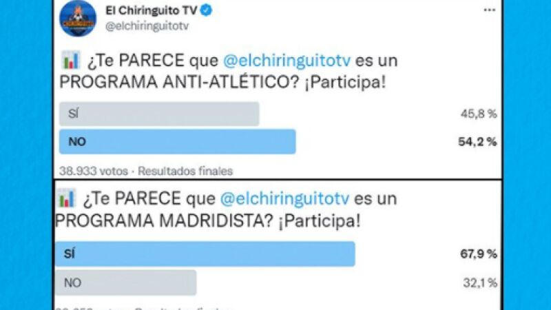 El Chiringuito cumplía hoy ocho años y lo hemos celebrado de la mejor forma, haciendo un balance del programa a través de nuestros espectadores. Para ello hemos realizado tres encuestas: ¿Te parece que El Chiringuito es un programa anti-atlético? ¿Te parece que El Chiringuito es un programa madridista? ¿Te parece que El Chiringuito es un programa anti-barcelonista?. La audiencia ha podido votar a través de Twitter y los resultados han sido claros. El Chiringuito es un programa madridista pero no es un programa anti-atlético ni anti-barcelonista.