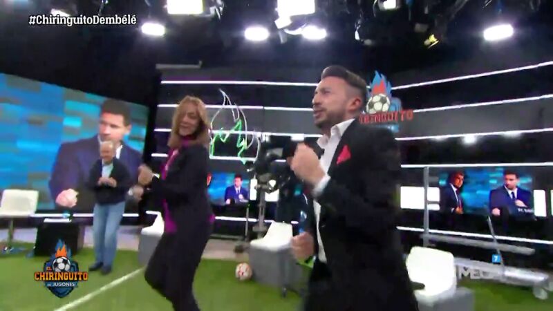 La cumbia sonó en el plató del Chiringuito. Después de ver las imágenes de Laporta y escuchar la canción "Ateo" de C Tangana, todos (o casi todos) los presentes se unieron a la fiesta de la cumbia de Matías.