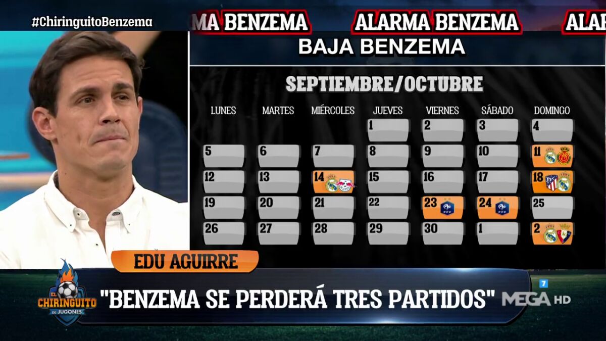Tras su lesión en el partido de Champions. Benzema estará unas tres semanas de baja, así lo ha contado Edu Aguirre.