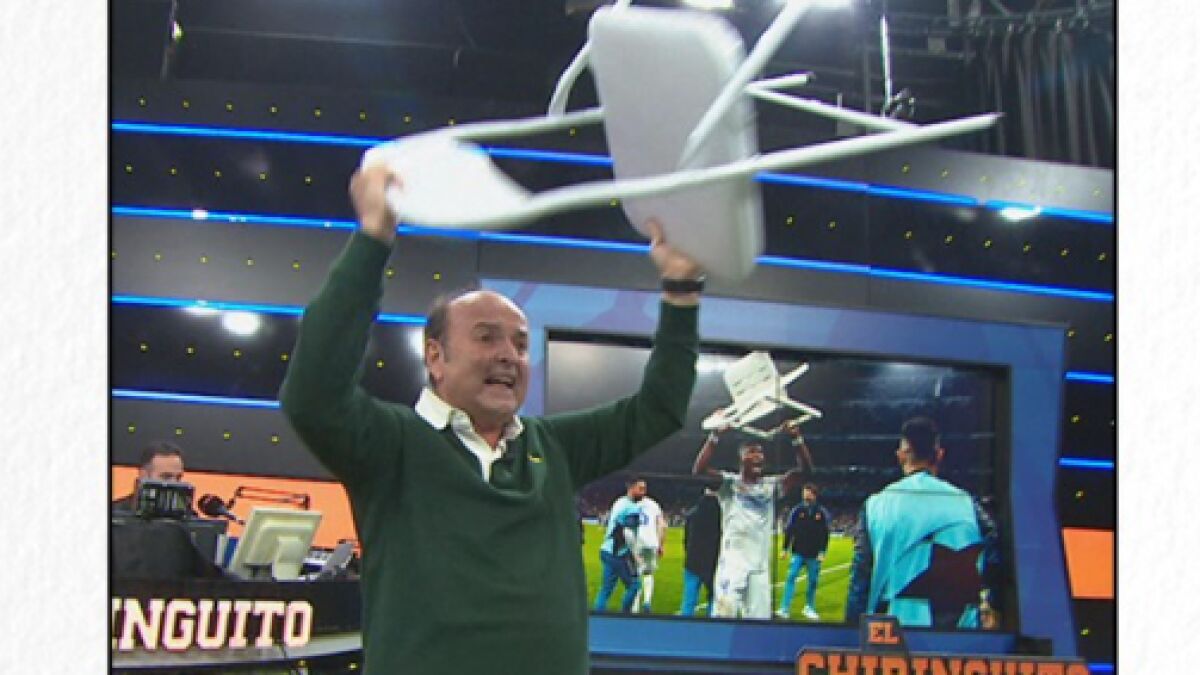 Primeras imágenes de Juanma Rodríguez en El Chiringuito tras la remontada histórica del Real Madrid ante el PSG. No puede contenerse, levanta y agita la silla a grito de "Esta es la silla del campeón de Europa". BRUTAL.