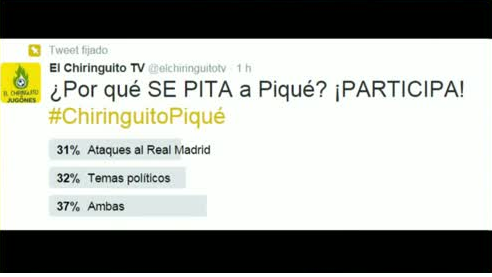 En El Chiringuito lanzamos la encuesta en Twitter: ¿Por qué se pita a Piqué? Al final de ella los resultados fueron los siguiente: Ataques al Real Madrid (31%), Temas Políticos (32%) y ambas (37%).