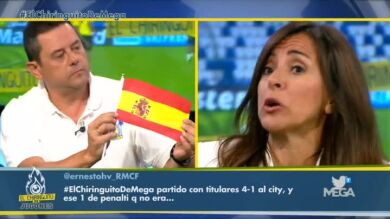 La imagen que indignó a Carme Barceló. Suena el himno del Barça y Roncero actuó enseñando la bandera de España.
