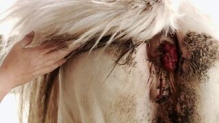 Tiene una especie de verruga y su olor es demasiado fuerte. Cuando el equipo veterinario comienza a curarle, apartan la cola y ven tejido sucio y una verruga que no tiene buena pinta. Para curarlo, lo hacen con gomas de castración, de tal forma que aprietan tanto que cortan la circulación y termina cortándolo. Esto evita el tener que intervenir quirúrgicamente.