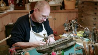 Un juguete de la época de la guerra es restaurado con éxito tras mucha limpieza y muchos detalles. Esta pieza histórica fue encontrada en una playa enterrada por completo. El juguete de más de 125 años, fue diseñado y creado en Francia. Steve repara minuciosamente el barco de juguete del siglo XIX que fue descubierto en una playa hace más de 65 años. Limpia las piezas que, afortunadamente, no están muy deterioradas.