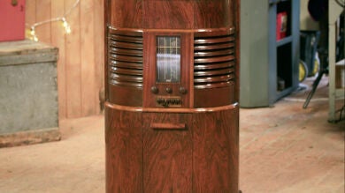 Se trata de un antiguo gramófono que está en un estado muy malo. Tim lo ha tenido que desmontar por completo y comprobar pieza a pieza lo que funcionaba y lo que no. Después de haberlo revisado completamente, llega el momento de presentárselo a su propietaria.