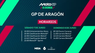 Tras esto, y con las parrillas de todas las categorías definidas, el circuito aragonés acogerá el domingo las carreras. LaSexta ofrecerá, desde las 9:30 h, un programa especial que comenzará con la última sesión previa a la carrera, el denominado Warm Up de MotoGP. Y, tras ello, la hora de la verdad para todos los pilotos. A las 11:00 h dará comienzo la carrera de Moto3; desde las 12:15 h la de Moto2; y para terminar la jornada de adrenalina pura, la de MotoGP desde las 14:00 h.