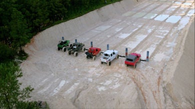 'La helada' es como llaman los creadores de 'Pickups & Furious' a la primera prueba del programa. Se trata de una carrera de velocidad por un circuito nada sencillo. Formado por polvo de caolín, se remoja y se ponen dos badenes con agua en la mitad del circuito. Si no conduces con precaución, el agua pueda entrar en el motor y destrozarte el coche. Si vas muy lento, perderás. Hemos asistido a la carrera más igualada del programa.